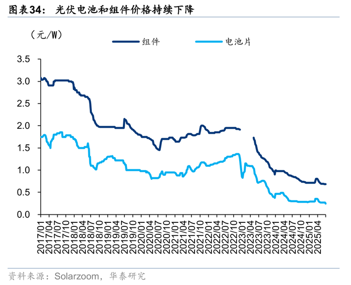 海外光伏需求仍呈现出“多点开花”的潜力,降息周期有望推动海外光伏需求的重新扩容。从需求弹性数据来看,2024年组件价格同比下降43%,当年中国光伏装机同比增长28%至277GW,海外组件需求同比增长32%至336GW,由此可见海外光伏需求对组件价格的弹性略大于国内。虽然单一市场可能同样面临来自电网的消纳压力,但是众多市场的多点开花使得海外光伏需求的韧性或更加充足。向前展望,美国降息周期即将启动,华泰宏观组在7月4日发布的《6月非农再超预期,7月降息概率回落》中预计美联储9~12月两次预防式降息;海外逐步降息或带动光伏项目收益率改善,促使海外光伏需求率先迎来反转。