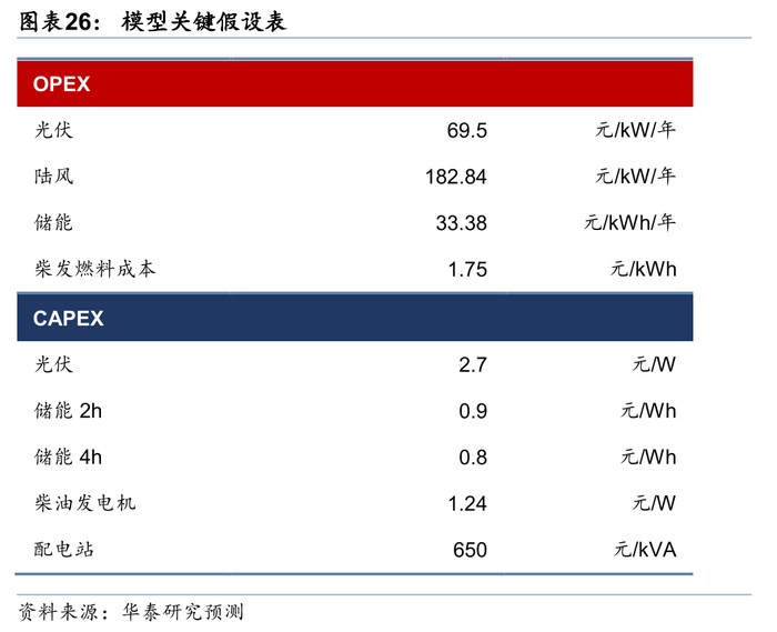 我们认为基于当前技术展望下,新能源+储能稳定供电的模式具备可行性,我们测算如果合理的配置风光储比例,在80%绿电利用率,最低发电成本可以做到0.30元/度,如增加柴发成本,可实现100%独立供电,成本在0.46元/度。当前光伏、储能投资成本持续快速下降。截至25年5月,2h储能系统、EPC价格分别下降至0.55、0.95元/Wh,相比23年8月已经下降47.7%、35.1%;4h储能系统、EPC价格分别下降至0.48、0.83元/Wh,相比23年8月已经下降62.2%、36.0%。如果光伏和储能价格更进一步降低到1.5元/w和0.65元/wh,较目前价格还有40%和27%下降空间,即可实现发电侧稳定供电,突破目前的需求天花板,带动光伏需求实现再一次高增。