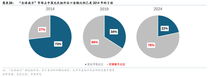 将组件+系统价格与日常家电相比,在欧美户用市场已经“家电化”,但是发展中国家尚未开始。2021-22年光伏的快速发展离不开中国和欧洲户用市场的崛起,欧美户用电价高且已经普及,但是中国因为居民电价低,且因为楼宇建筑安全等问题尚未推广,而农村户用这几年已经蓬勃发展但偏向于发电而非自用。即便如此,我们也应该看到光伏的特性和潜力以及与其他产品最大的不同是可以“家电化”。而近几年光伏系统的成本下降已经从一套十万到几万元,现在阳台光伏系统只需要几千元,可以大幅降低购买门槛。全球人均用电量参差,欠发达区域的人口巨大但用电量很少,以非洲为例人均居民用电量仅250度电/年(中国居民人均为1,067度/年,OECD国家为2,888度电/年)。根据世界银行数据,非洲平均电价高达人民币0.98元/度,而全非洲人口却达到13亿人以上,因此考虑到新能源发电成本低于0.3元/度,且非洲存在较强光照条件,不存在土地限制,极具性价比优势。如考虑人均用电上升100度一年,即可以带来104GW的需求空间。2014年以来,“全球南方”市场占中国光伏组件出口金额比例已是2014年的3倍,从总占比1/4的分散小市场,成长为占比超过3/4的出口主力。2024年中国面向“全球南方”市场的组件出口保持高增长,抵消欧洲需求放缓的冲击,成为重要的稳定器。