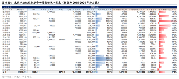 2)对金融系统影响较小,银行融资占比相对较低。银行在光伏行业股权层面介入不多,主要是项目贷款和企业信用债务。我们整理光伏产业链主要企业的资本开支来源(2015-2024年合计投入6000亿元),其中二级市场融资占投入比例高达41%,部分企业几乎完全依赖二级市场融资。这和传统产业大量举债、引入银行贷款的模式形成差异。也因此当政府考量政策救济时,不会像传统周期行业担忧产能出清导致银行坏账、进一步对全社会经济造成负面溢出效应。另一方面,动用财政等手段进行产能淘汰的奖补举措也可能存在道德风险。