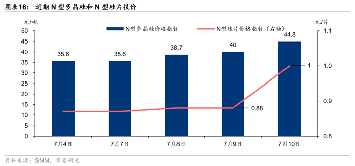 光伏“反内卷”加强行业信心,硅片和硅片出现明显提涨。硅料环节,根据硅业分会数据,截至7月9日周内多晶硅n型复投料成交均价3.71万元/吨,环比上涨6.92%,而硅料报价区间提升至4.5-5.0万元/吨,环比上调25%-35%,主要系硅料企业为符合价格法规提价至综合成本线之上。硅片亦相应跟涨,根据SMM报价数据,7月10日N型183/210/210R硅片分别提涨0.12/0.16/0.15元/片至1.00/1.35/1.15元/片,涨幅分别达13.6%/13.4%/15.0%。