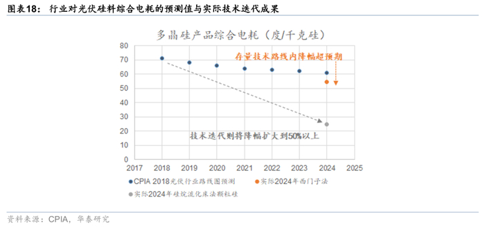 硅料环节过去7年的发展历史也同样证明了光伏技术迭代的威力。以综合电耗这一指标来看,CPIA中国光伏协会在2018年预计2025年这一指标可以下降14%,最终各企业努力下西门子法的实际降幅达到23%,而行业中通过硅烷流化床法颗粒硅的技术迭代,将这一参数直接降低了65%。由此可见光伏行业新技术迭代的重要意义。