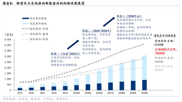 根据我们2024年10月25日发布的《多维解决消纳问题,新能源迈入2.0时代》,通过“资源量,成本,技术,商业模式”等多个维度对供给侧,煤电深调、抽水蓄能、煤电启停等灵活性进行分析,预计最终我国新型电力系统在2030年在三种不同情景下每年将分别提供190GW(悲观)、340GW(基准)、571GW(乐观)的新能源消纳空间。