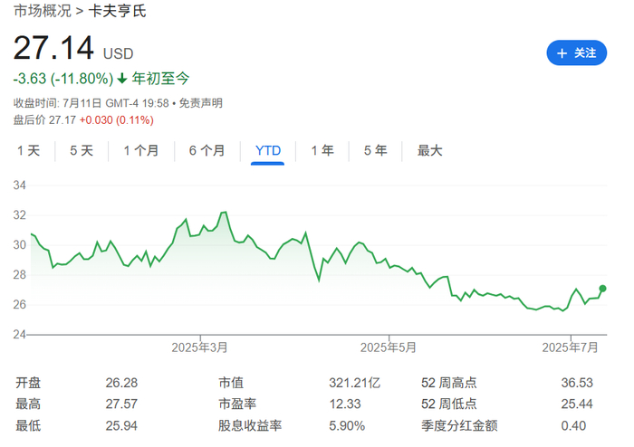 因此如今该公司希望通过分拆提升整体估值,使两个独立实体的总价值超过卡夫亨氏目前约310亿美元的市值。消息传出后,卡夫亨氏股价周五收涨超2%,扭转日内跌势。