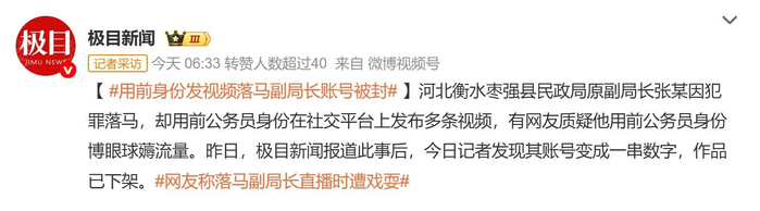 据媒体7月11日报道,河北衡水枣强县民政局原副局长张某因犯罪落马,却用前公务员身份在社交平台上发布多条视频,有网友质疑他用前公务员身份博眼球薅流量。