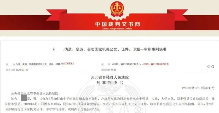 公开信息显示,张某曾因犯伪造国家机关证件、印章罪,于2019年12月27日被判处有期徒刑七个月,并处罚金人民币五千元。