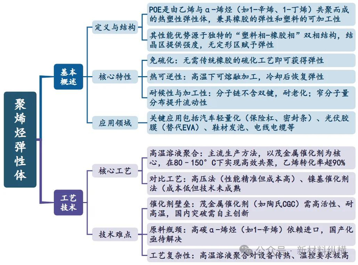 聚烯烃弹性体(Polyolefin Elastomer,POE)是一类重要的合成弹性体材料,其分子结构由乙烯单体与α-烯烃(如1-丁烯、1-己烯、1-辛烯等)通过无规共聚反应形成。这种特殊的分子结构赋予了POE优异的弹性和力学性能,广泛应用于汽车制造、包装材料、电线电缆、医疗器械、家用电器、太阳能电池封装膜、光伏组件以及热熔胶等。