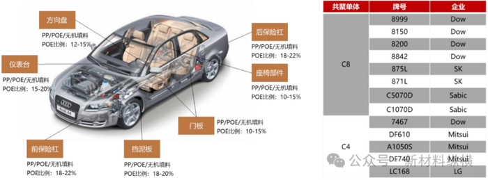 2)工程塑料增韧领域POE可对PA和聚酯类聚合物进行增韧改性,其产品在建筑、机械、电子、汽车及日用品等多个领域具有重要应用价值。