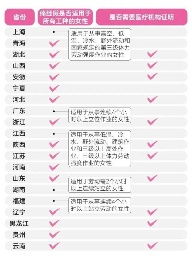 各地“痛经假”的区别主要涉及两个方面:适用的工种范围和是否需要医疗证明。