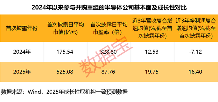 从成长性来看,以过去3年的营业收入及净利润复合增速来看,截至2025年(取机构一致预测数据),参与并购重组半导体公司的营业收入复合增速均值接近20%,较上一年的均值提升7个百分点以上;净利润复合增速平均值(剔除极端负值)16.4%,上一年平均值为负值。