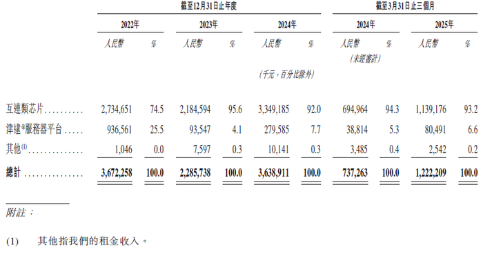 澜起科技的收入来自销售(i)互连类芯片;(ii)津逮®服务器平台及(iii)其他。