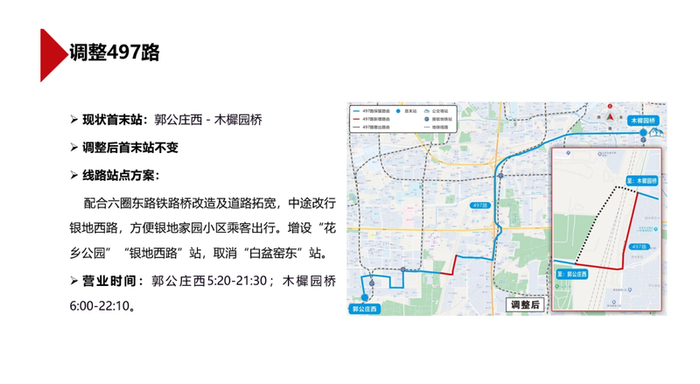 此次涉及调整的线路为497路、专190路。其中,497路的调整,配合六圈东路铁路桥改造及道路拓宽,中途改行银地西路,方便银地家园小区乘客出行。线路首末站不变(郭公庄西-木樨园桥),增设“花乡公园”“银地西路”站,取消“白盆窑东”站。