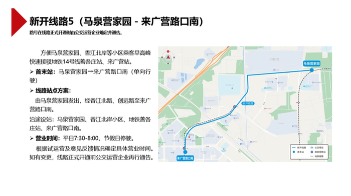 该线路可方便马泉营家园、香江北岸等小区乘客早高峰快速接驳地铁14号线善各庄站、来广营站。营业时间(暂定):平日7:30-8:00,节假日停驶。根据试运营及意见反馈情况确定具体营业时间。