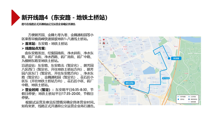 该线路可方便朗芳园、金隅七零九零、金隅通和园等小区乘客早晚高峰快速接驳地铁1-八通线土桥站。营业时间(暂定):东安路平日6:35-8:30,节假日停驶;地铁土桥站平日17:35-20:00,节假日停驶。根据试运营及意见反馈情况确定具体营业时间。