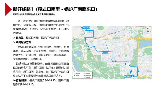 该线路可进一步方便石景山金顶街地区模式口南里、赵山小区、金顶街二区、金顶街四区等小区居民出行,接驳地铁6号线、11号线、S1线金安桥站、地铁1-八通线古城站。营业时间:模式口南里6:30-18:30;锅炉厂南路东口7:10-19:10。