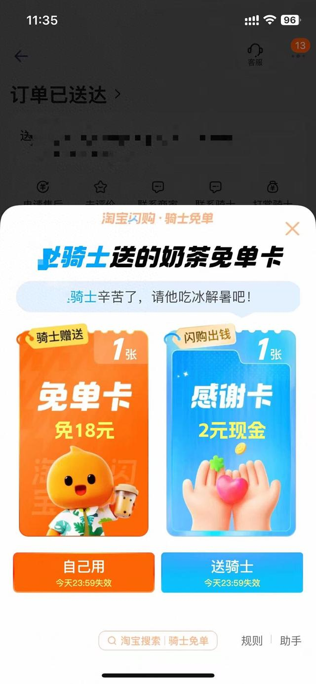 记者很幸运地在淘宝闪购抽到了一张奶茶免单卡和骑士感谢卡,小程今天也在淘宝闪购下单了外卖,但并没有抽到免单卡。需要注意的是,淘宝闪购免单卡可以使用的产品也比较有限,但是有些免单商品最后只需要付很少的钱就可以由骑手送货到家。