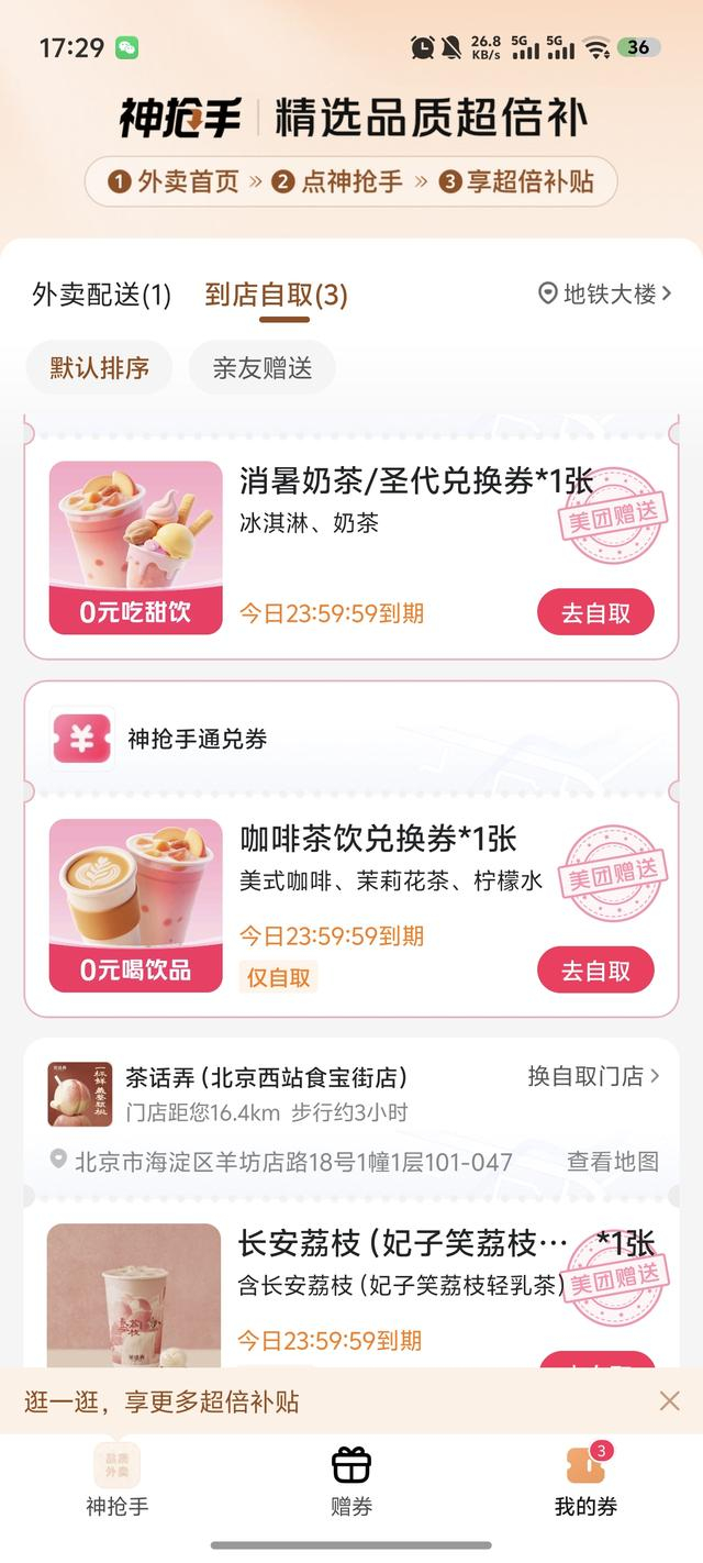 《中国经营报》记者观察这一波外卖大战发现,美团的补贴来得更简单直接,多数用户点开美团外卖,系统就会跳出“0元外卖券”,其中既有外卖配送的茶咖兑换券,也有到店自取的茶咖兑换券。