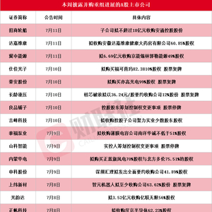 财联社7月12日讯(编辑 平方)A股市场并购重组持续活跃。据财联社不完全统计,截至发稿,本周披露并购重组进展的A股上市公司共有19家,包括招商轮船、达嘉维康、冀中能源、仕佳光子、秦安股份、长龄液压、良品铺子、吉峰科技、泰福泵业、山科智能、内蒙华电、申科股份、上纬新材、光韵达、正帆科技、蓝黛科技、长鸿高科、ST凯利和杭叉集团,具体情况如下图: