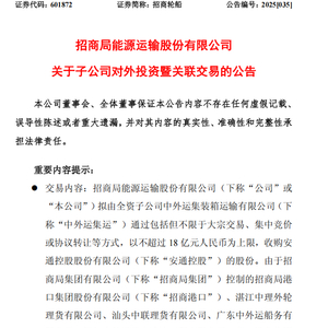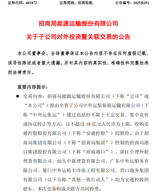 【导读】招商轮船重启整合战略,旗下全资子公司拟不超过18亿元收购安通控股股份