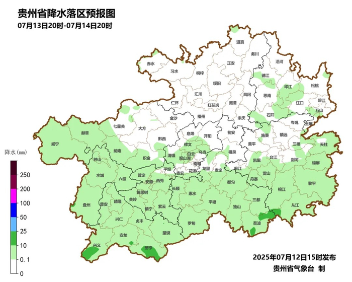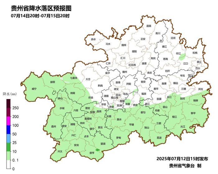 7月14日夜间到15日白天,全省多云,午后南部和西部有分散阵雨或雷雨,遵义市大部、铜仁市、黔东南州大部、黔南州南部边缘有35℃以上的高温,个别市县超过37℃。