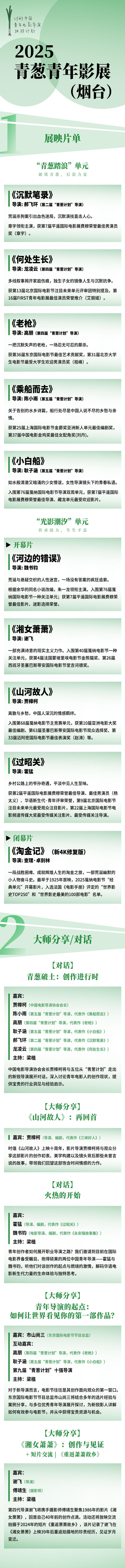 这一由中国电影导演协会主办的“青葱计划”(CFDG中国青年电影导演扶持计划)品牌展映活动,由烟台市、中央广播电视总台央视频、人间指南合作支持,分设“青葱踏浪”和“光影潮汐”两个展映单元,将在4天的时间里展映10部影片,举办5场大师分享及对话活动。