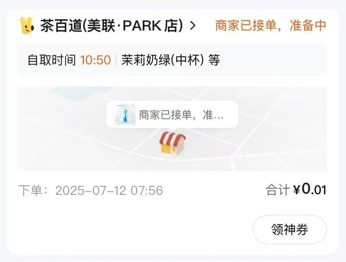 据网友晒出的订单,仅支付0.01元就点到了茶百道的中杯茉莉奶绿外卖。