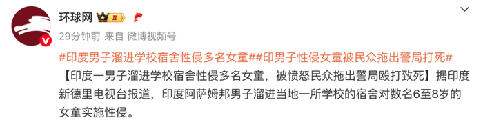 据印度新德里电视台报道,印度阿萨姆邦男子溜进当地一所学校的宿舍对数名6至8岁的女童实施性侵。部分学生家长在女儿抱怨腹痛等不适后带她们去医院就诊,才得知了这一恶劣事件。其中一名女孩的家长报案,该男子在7月10日被捕。7月11日,数名当地民众得知了这一消息后愤怒地冲进警察局将该男子拖到室外并进行殴打,在更多警察赶到现场尝试控制局面时男子已被殴打致死。