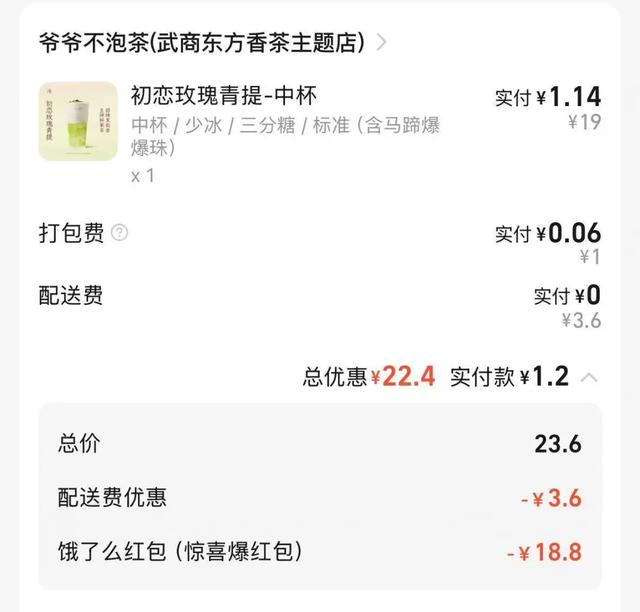 随后,记者打开淘宝闪购,又收到满18.8元减18.8元、满20元减10元等多张满减力度不等的大额优惠券。记者尝试下单发现,一杯原价19元的奶茶,在平台大额红包加持下,最终仅需支付1.2元。