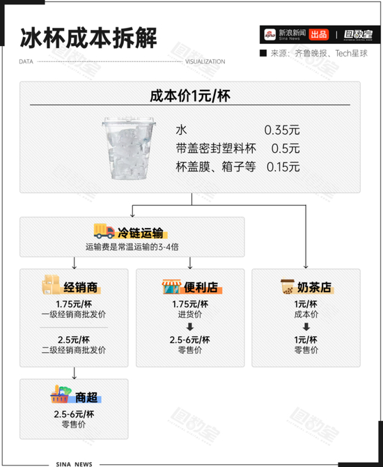 另一方面,一个冰杯从工厂到商店,再到我们手里,中间过程可不简单。冷链运输、经销商层层加价、店铺房租人工水电……这些成本堆起来,一杯冰就得卖2.5~6元。相比之下,奶茶店的冰杯由于现制现卖,没有中间商赚差价,因此可以1元成本价拿下。
