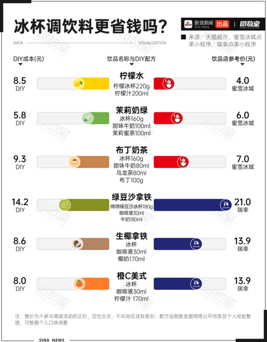 那么,自制冰杯饮料真能省钱吗?图数室帮你们算了一笔账,把热门冰饮的DIY成本,跟蜜雪冰城、瑞幸这些性价比之王的成品价做对比。我们发现,用冰杯搞奶茶,省钱优势不明显;但要是调咖啡,确实能省下一点。