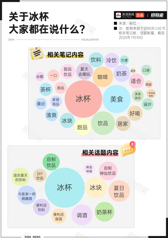 通过查询小红书近90天有关冰杯的相关笔记和话题内容,关键词都围绕着“方便、好喝、清爽、夏天、调酒、DIY、奶茶、微醺、便利店”展开。