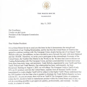 “多年来,我们一直在讨论与欧盟的贸易关系,并得出结论,即美国必须摆脱由欧盟关税、非关税政策和贸易壁垒造成的长期、巨大且持续的贸易逆差,”特朗普在信中向冯德莱恩表示,“不幸的是,我们的关系远非互惠互利。”
