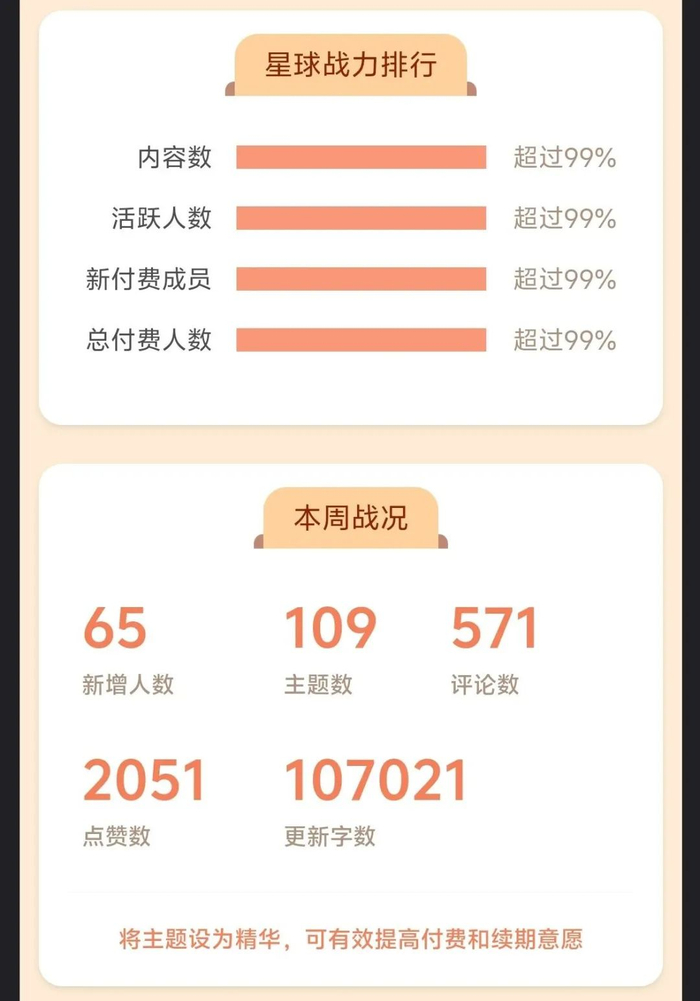 与此同时,几乎每周,在全市场知识星球的战力榜里,不管是“内容数”、还是“活跃人数”,都处于霸榜的状态,处于Top 1%的级别。