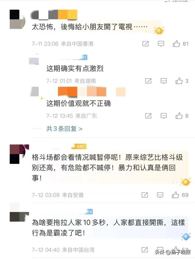 在综艺官博评论下,周深粉丝控诉节目组“漠视安全问题”“罔顾嘉宾人身安全”等,部分观众则认为这期节目暴力场景过多,价值观不正确。