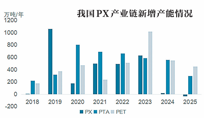 2025年,PX暂无明确的产能增长,全行业处于调整缓和阶段。国内PX供应将偏紧,企业开工率上升,但自给率仍有所下滑,需进口货源补充。产业下游精对苯二甲酸-聚酯(PTA-PET)过剩趋势仍在,产业链利润集中到原料端,下游产品出口仍是化解产能过剩的重要途径。