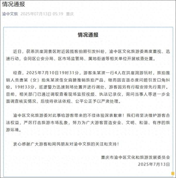 经查,2025年7月10日19时31分,游客朱某波一行4人在洪崖洞游玩时,旅拍推销人员唐某(女)拍朱某波侄女肩膀推销旅拍产品,继而因言语态度问题引发口角纠纷。19时33分,巡逻警力迅速到场处置并进行调处,游客因另有行程安排先行离开。目前,相关部门已通过调取查看现场监控视频、执法记录仪,询问当事人等进一步全面调查核实情况,后续将依法依规、公平公正予以严肃处理。