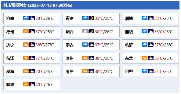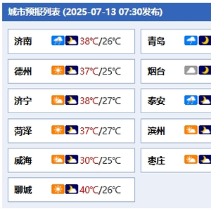 13日白天到夜间,东营、临沂、日照、鲁中和半岛地区天气多云间阴有雷雨或阵雨,其他地区天气晴转多云。北风,半岛地区3~4级增强到4~5级阵风6~7级,其他地区3~4级,雷雨地区雷雨时阵风8~10级。夜间最低气温:鲁中山区和半岛地区24°C左右,其他地区27°C左右。最高气温:菏泽、济宁、鲁西北和鲁中地区37~39°C,局部40°C以上,沿海地区29~32°C,其他地区33~36°C。