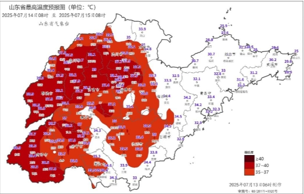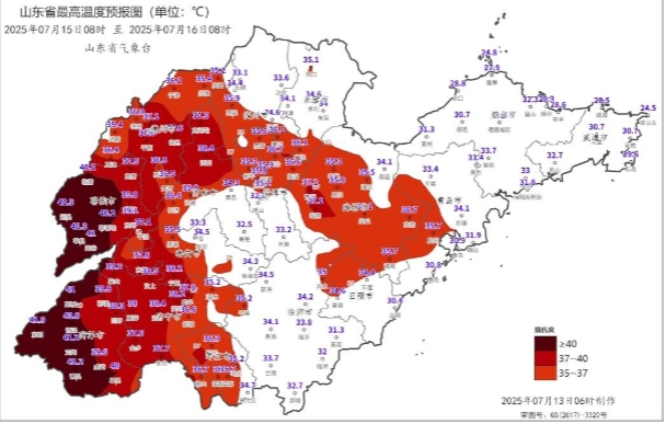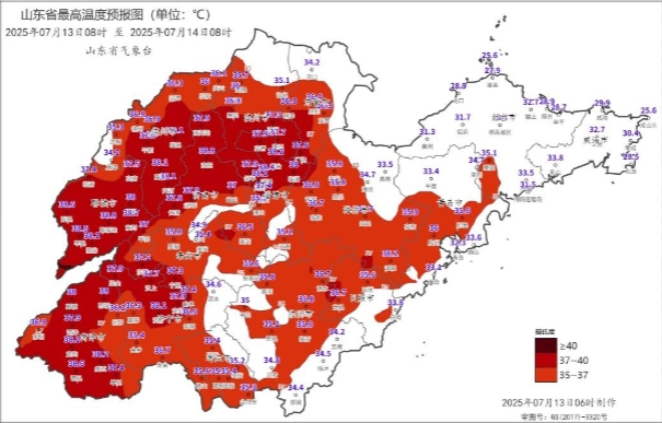 山东省气象台于7月13日06时00分继续发布高温橙色预警:预计13—14日最高气温:菏泽、济宁、鲁西北和鲁中地区37~39℃,局部40℃以上,沿海地区29~32℃,其他地区33~36℃。15日最高气温:菏泽、济宁、聊城和德州38~40℃,局部42℃以上,沿海地区29~33℃,其他地区34~37℃。