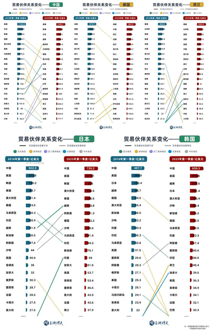 谭主梳理了美国之外全球前五大贸易国——中国、德国、荷兰、日本、韩国的贸易伙伴关系变化。