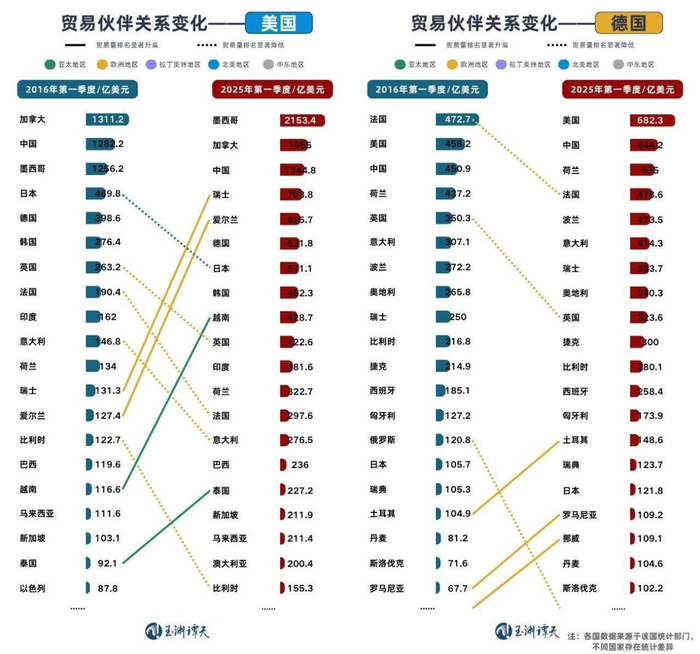 美国贸易伙伴的变化,集中在亚太地区的盟友国家和欧洲。