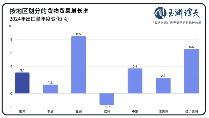 当前,全球87%的贸易都发生在美国之外。2024年,亚洲、拉丁美洲和中东地区的贸易增速均高于全球平均水平。