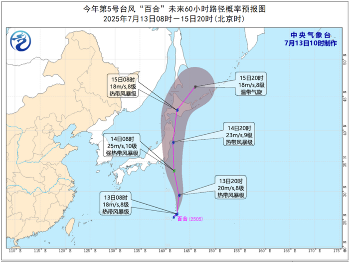 据中央气象台消息,今天凌晨,今年第5号台风“百合”(热带风暴级)生成。今天(7月13日)上午8点钟,中心附近最大风力有8级(18米/秒)