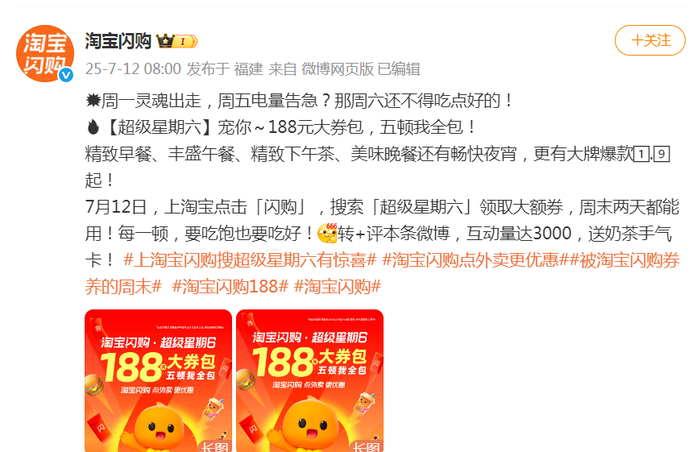 淘宝闪购表示,继续发放“超级星期六”188大券包。
