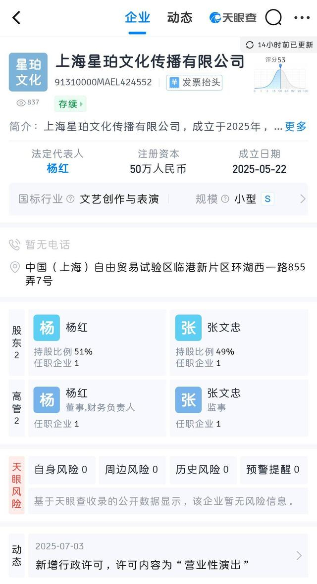 天眼查显示,上海星珀文化成立于2025年5月22日,注册资本50万,主要人员显示为2人,这两人为该公司的两名股东。侃爷演唱会在今年6月12日获得上海市营业性演出准予许可, 6月23日上海星珀文化和大麦共同官宣,到7月12日晚正式演出,从公司成立到正式演出时间都不到两个月。