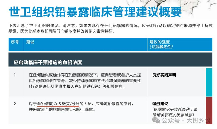 2021年10月,世卫组织发布《世卫组织铅暴露临床管理指南》,建议对血铅浓度超过每升50微克的人员,应确定铅暴露的来源,采取适当措施来减少和终止暴露。(注意下图单位为每分升5微克,10分升等于1升)