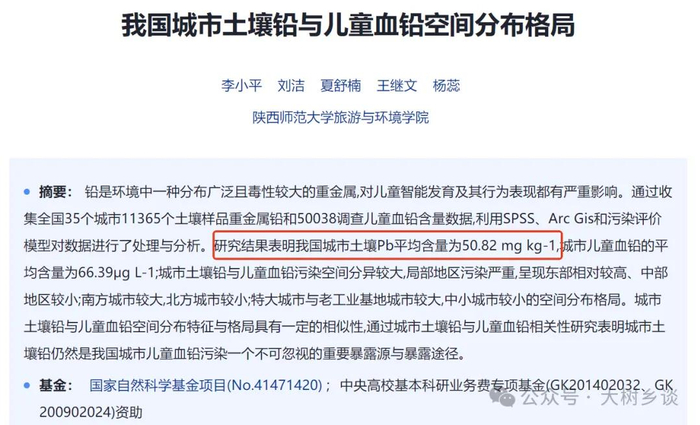 注意此前无论含铅汽车尾气、工业废水废气、含铅涂料等等,产生的铅污染并没有消失,而是沉积在土壤中,尤其是城市和工业区土壤。自然状态下,中国离城市远和未污染土壤的含铅量一般在每公斤10到30毫克,而根据陕西师范大学李小平等2015年《我国城市土壤铅与儿童血铅空间分布格局》,当时中国城市土壤含铅量平均为50.82毫克,大大超越自然值。