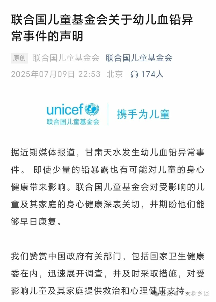 而联合国儿童基金会针对这一事件发表声明,则赞赏中国政府有关部门迅速开展调查,并及时采取措施。