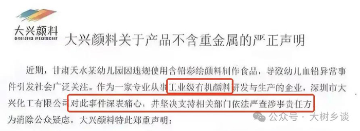 3、提到在深圳的颜料生产商“大兴颜料”发通报说产品不含铅,误认为“血铅事件”涉及的颜料是这家公司生产的,由此质疑通报。