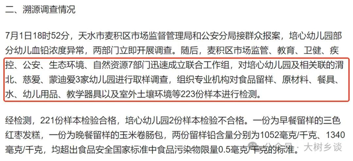7月1日晚18时52分接到报案,市监和公安先介入,随后教育、卫健、疾控、生态环境、自然资源加入组成七部门联合调查,取样233份,已经对涉事幼儿园和关联的其他三所幼儿园进行了全面取样调查,网上质疑的水源、土壤以及没有提到的幼儿园设施、幼儿用品等等,都已经取样了。最终233个样本查出2个样本不合格,就是通报中提到的留样的三色软枣发糕、玉米卷肠包。
