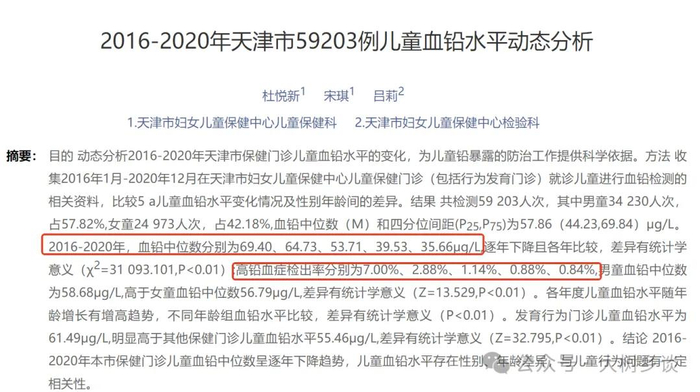 比如天津市妇女儿童保健中心杜悦新等人于2022年发表论文《2016—2020年天津市59203例儿童血铅水平动态分析》,该论文统计了天津59203人次的儿童血铅检测情况,统计显示历年血铅中位数为每升69.4微克、64.73微克、53.71微克、39.53微克、35.66微克,而“高血铅症”检出率分别为7%、2.88%、1.14%、0.88%,也就是说哪怕到2020年,天津仍然有接近1%的被检测孩子血铅浓度超过每升100微克。